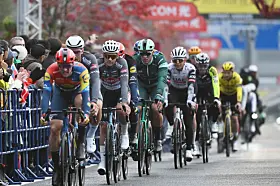 Riders including Red Bull-Bora-Hansgrohe rider Primoz Roglic of Slovenia (front L) compete in the Tour de France Saitama Criterium cycling race in Saitama on November 9, 2025. (Photo by GREG BAKER / AFP)GREG BAKER